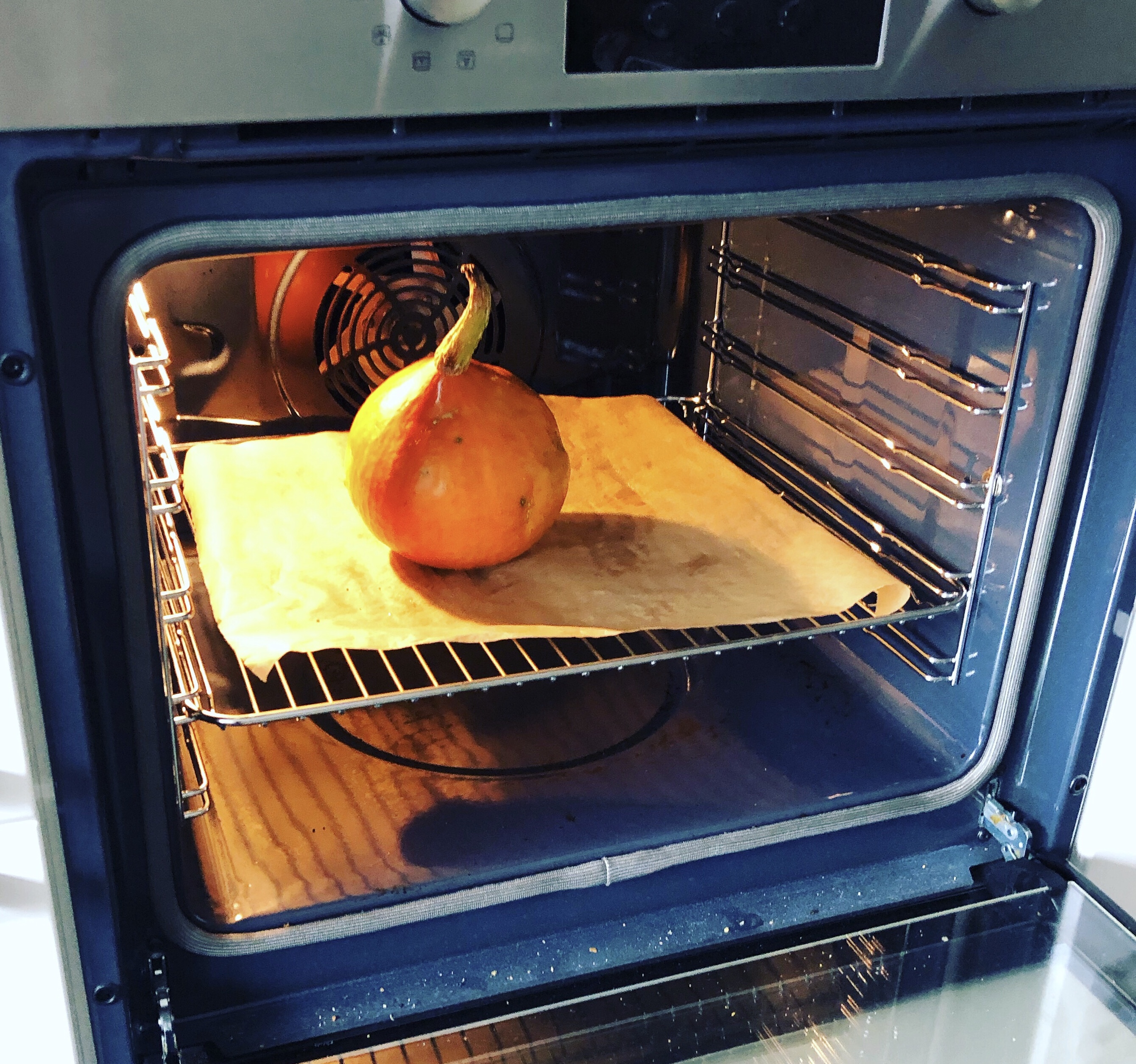 Den Hokkaido-Kürbis waschen und schneiden und entkernen und in Würfel schneiden. Ich lege ihn dafür vorher ca. 30 min bei 175 Grad (Umluft) in den Backofen. Das erleichtert deutlich die Schneidearbeit. Mit anderen Worten: bevor ich den Ofen-Tipp gelesen habe, musste mein Mann ihn immer schneiden, da es doch sehr schwer geht.