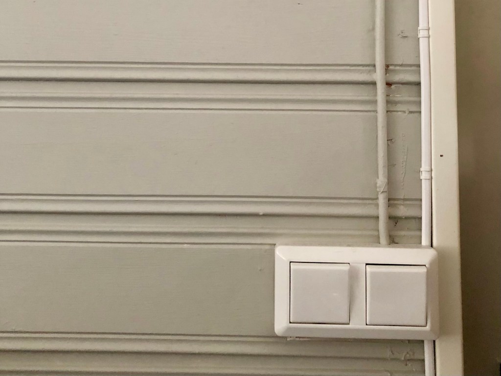Stromleitungen sind zumindest bei älteren Immobilien nicht komplett in der Wand versteckt, sondern verlaufen teilweise außen sichtbar, meist an der Fußleiste der Wand. Unsere erste Mietwohnung in Norwegen, die wir 2011 bezogen, stammte aus den 50er Jahren, sie war innen zwar längst renoviert worden, aber dennoch waren die Stromleitungen außen an der Wand angebracht, was ich so vorher noch nie gesehen hatte und einen altmodischen Eindruck auf mich machte. Mittlerweile habe ich mich an den Anblick gewöhnt, auch in unserem jetzigen Haus sind die Stromleitungen sichtbar (siehe Bild). Erst in neueren Häusern, ab ca. Baujahr 2000, sind die Stromleitungen in der wand versteckt.