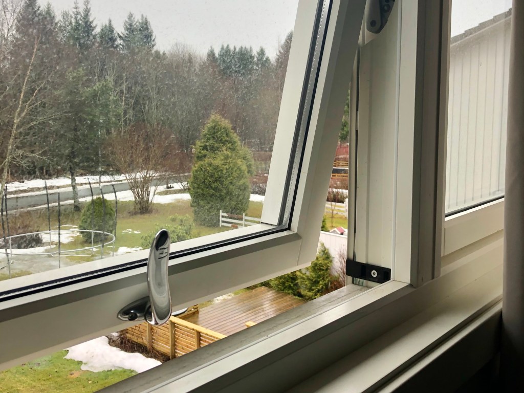 Die Haustüren, Terrassentüren, sowie Fenster werden in Norwegen idR nach außen geöffnet. Den Grund dafür kenne ich nicht, vermute aber, dass dadurch eine Flucht im Falle eines Brandes erleichtert werden soll, bei Fenstern könnte ich mir vorstellen, dass zusätzlich noch ein Hereinregnen verhindert werden soll, denn die Fenster werden hier idR von unten nach außen geöffnet.