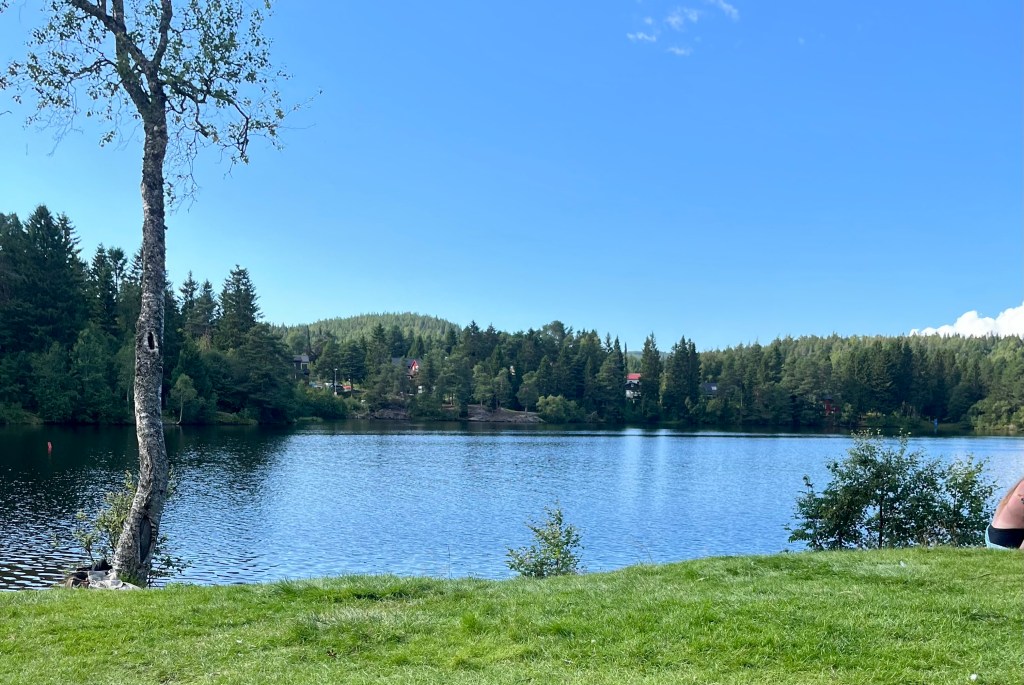 Alternativ kann man auch bei Ferista parken und läuft dann über die Straße, auf der anderen Seite dieht msn dann dchon den Eingang zum skogsmøteplass, wo aich ein Waldspielplatz für Kinder befindet. Von dort aus folgt man einfach dem Pfad runter zum Bach, am Golfplatz vorbei und um den See.